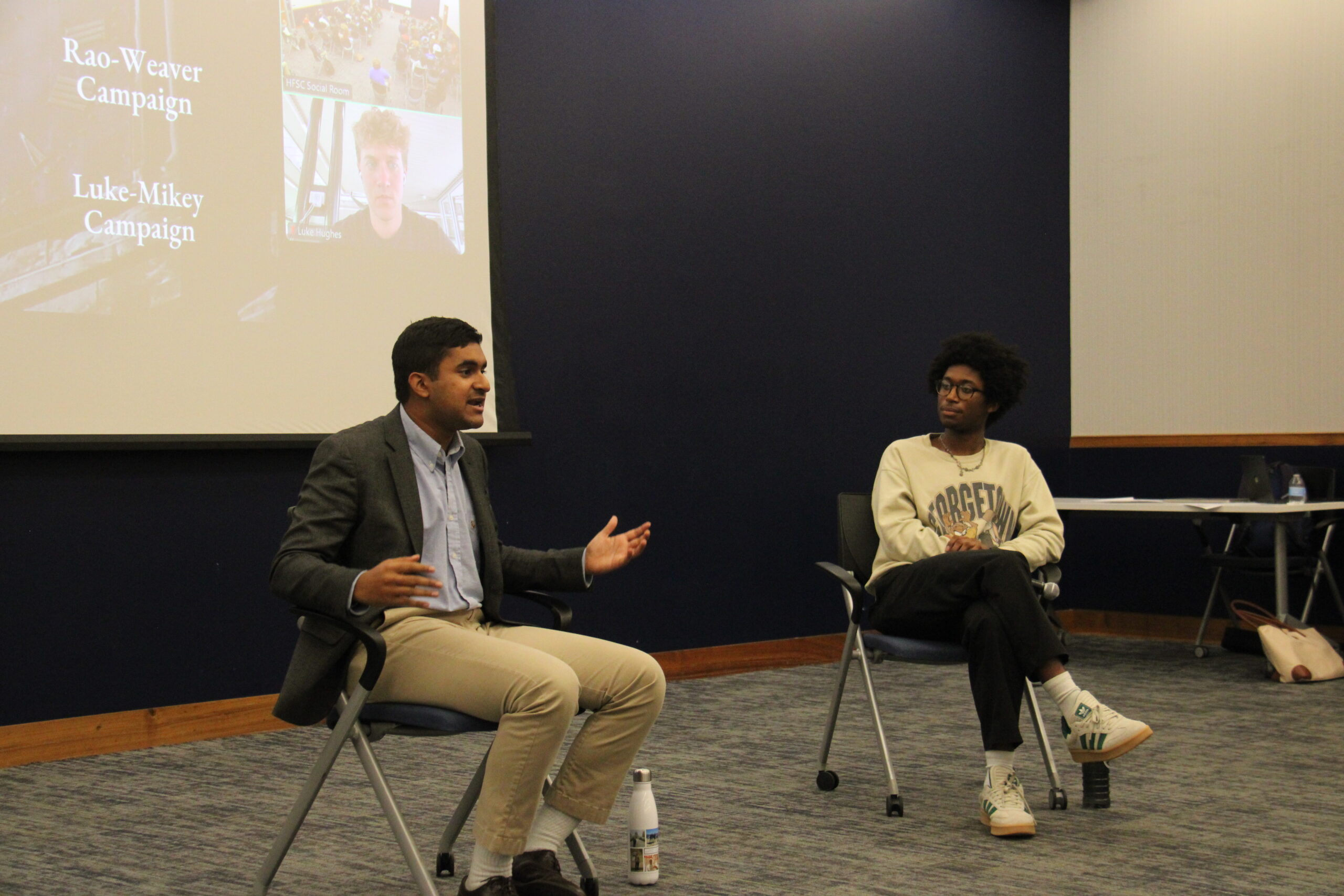 The Georgetown Bipartisan Coalition moderated the annual GUSA Executive town hall on Oct. 15. It featured executive campaigns for Saahil Rao (SFS ’27) and Zadie Weaver (CAS ’28), Darius Wagner (CAS ’27) and Nazgol Missaghi (CAS ’28), and Luke Hughes (SFS ’27) and Mikey Williams (SFS ’28).