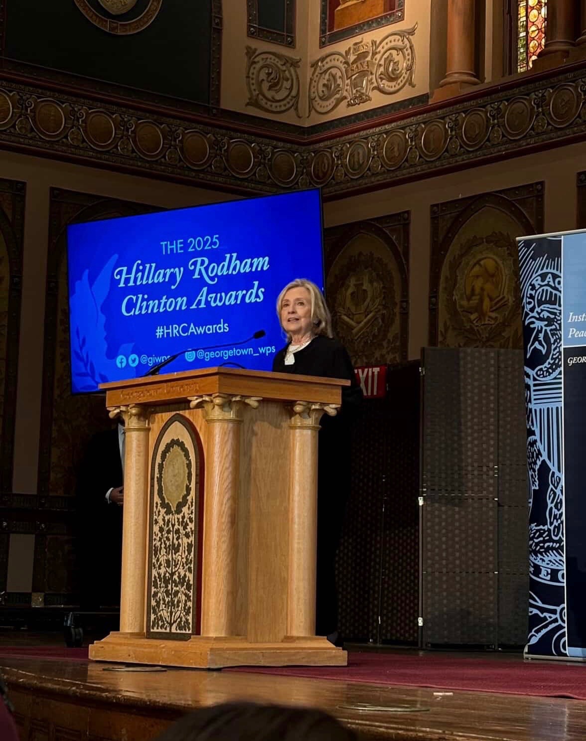 “Power and leadership is still dominated by men, with women being sidelined despite evidence— much of it coming from the Georgetown Institute for Women, Peace and Security—that women being involved in peacemaking and peace securing to make peace last,” Clinton said.