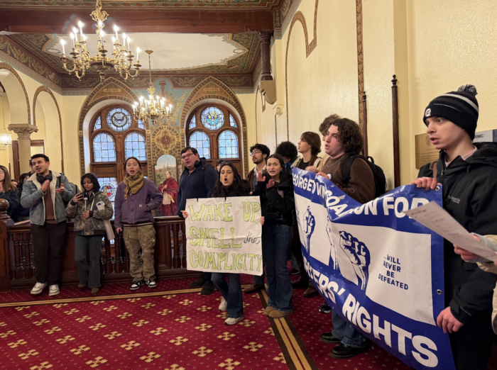 At the end of the rally, students marched to the office of Georgetown interim President Robert Groves to present the Georgetown administration with a petition, calling for fair contract negotiations with facility workers.