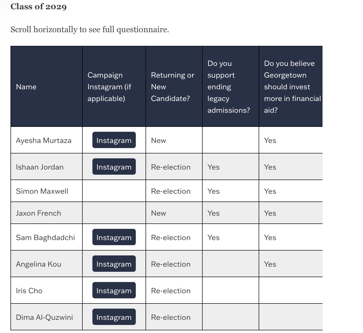 Name | Campaign Instagram (if applicable) | Returning or New Candidate? | Do you support ending legacy admissions? | Do you believe Georgetown should invest more in financial aid? | Do you support increased student conduct standards for Georgetown club leaders? | Do you think that Georgetown should maintain its DEI policies? | Do you support GUSA sponsoring student protests? | Do you think Georgetown should provide free contraceptives to students? | Do you support the creation of a new queer living learning community? |